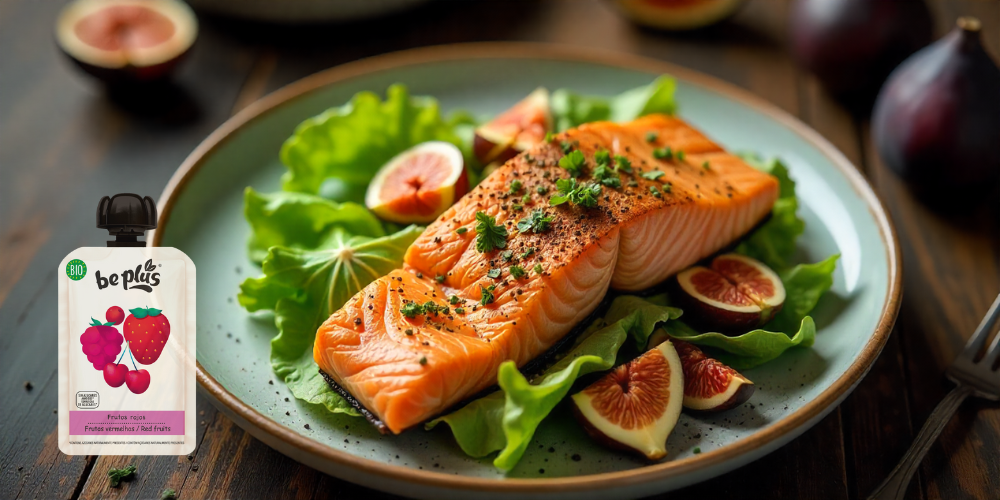 Ensalada completa con salmón, pepino, higos y vinagreta con pouch de frutos rojos Be Plus