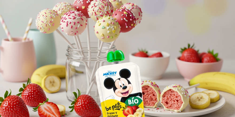 En esta receta, el pouch de fresa y plátano Be Plus se transforma en el corazón suave y natural de unos cake pops coloridos y divertidos.