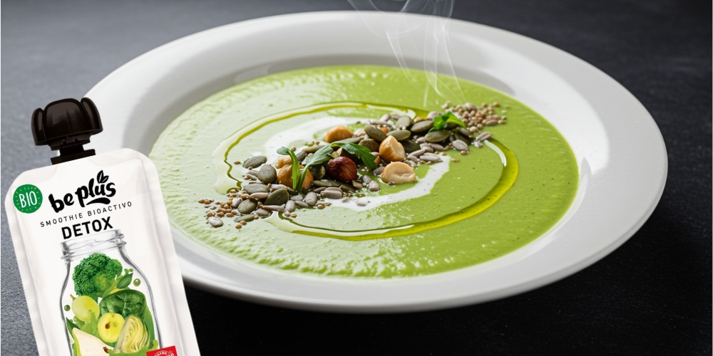 En esta receta, el Smoothie Detox Be Plus se transforma en una base líquida rica en matices que potencia una crema vegetal suave y reconfortante.
