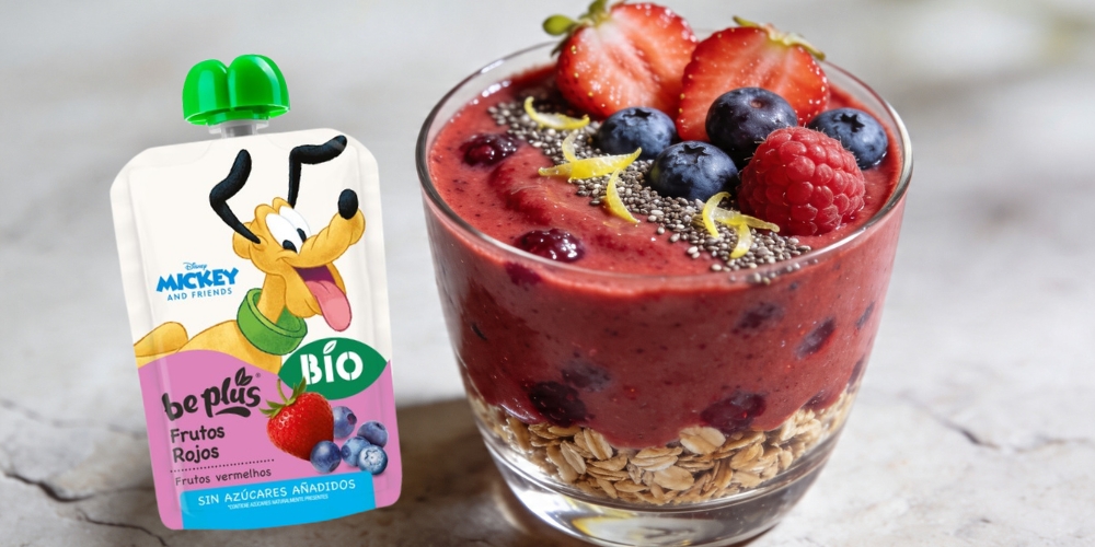 En esta receta, el pouch de frutos rojos Be Plus se transforma en una crema fría ligera y vibrante, donde su combinación de frutas ecológicas —manzana, pera y frutos rojos como fresa, cereza o arándano— aporta un perfil equilibrado entre dulzor y acidez.
