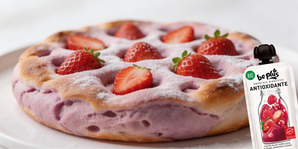 Esta receta lleva el smoothie antioxidante Be Plus a un formato totalmente inesperado: una focaccia dulce y esponjosa, con un acabado brillante y toppings de fruta. El resultado es un híbrido entre pan y postre, con textura aireada, sabor frutal (frutos rojos + remolacha) y un look brutal para contenido visual.