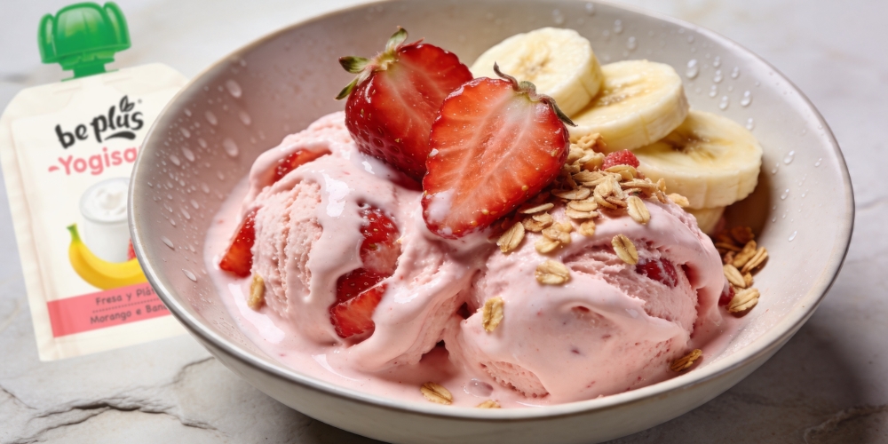 En esta receta, el pouch de yogur, fresa y plátano Be Plus se transforma en una base helada suave y natural, aprovechando su combinación equilibrada de lácteos y fruta. Su textura cremosa —procedente del yogur junto con el puré de plátano y fresa— permite obtener un helado ligero sin necesidad de elaboraciones complejas.
