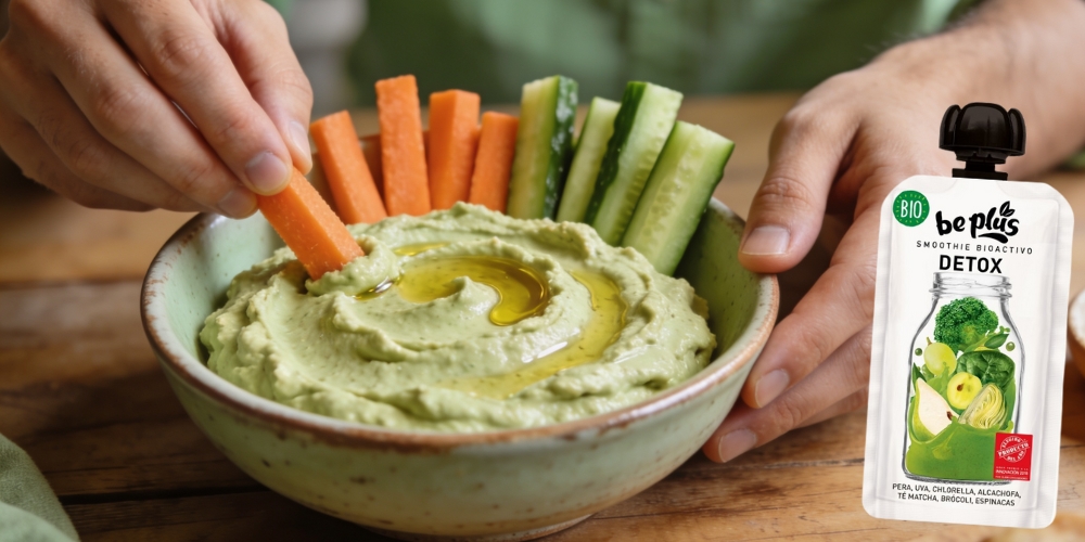 En el día a día también hay espacio para preparar algo juntos y disfrutarlo sin complicaciones. Esta receta utiliza el Smoothie Detox Bio Be Plus para aportar un toque vegetal y fresco a un hummus suave, creando una propuesta equilibrada y fácil de integrar en la rutina. Pensada para hacer entre dos, compartir y adaptar al momento.