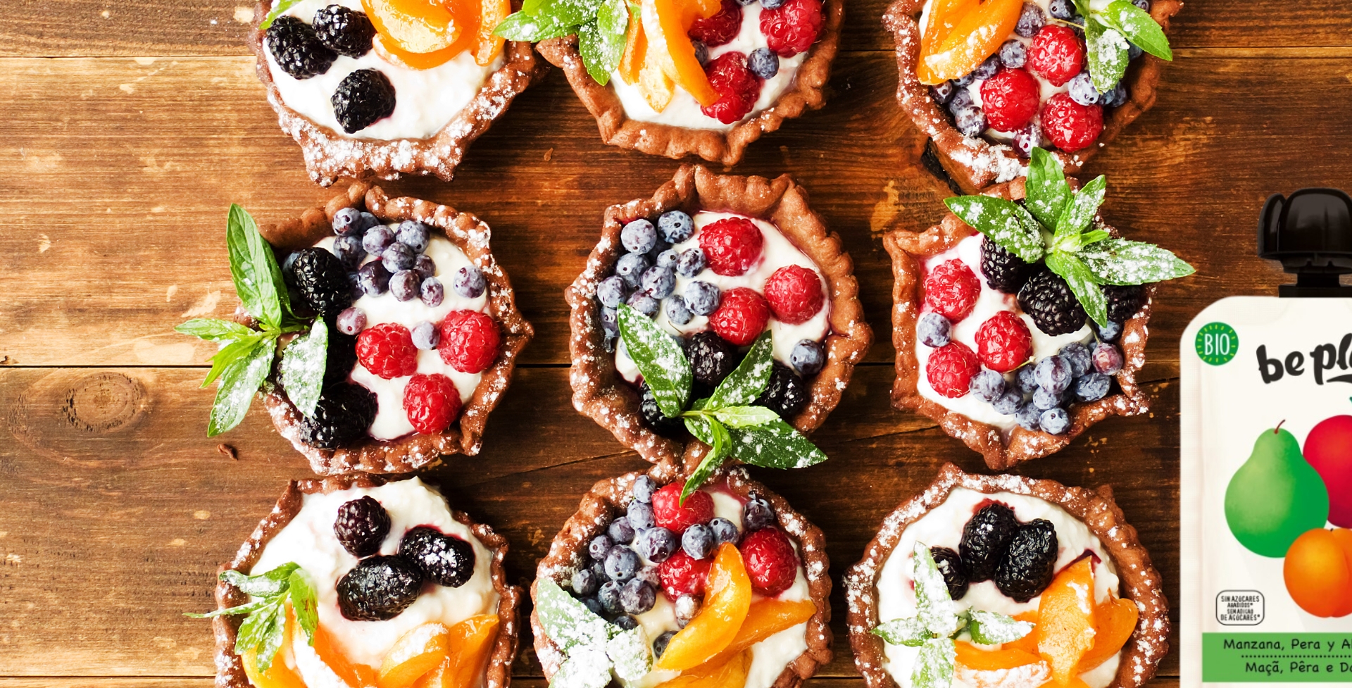 En primer lugar, si deseas una base más cremosa, colocamos una cucharadita de yogur natural en el fondo de cada tartaleta. Luego, añadimos una capa generosa del pouch de fruta BePlus Baby sobre la base o directamente en la tartaleta. A continuación, colocamos trocitos de fruta fresca encima para dar color y textura. Añadimos una hojita de menta si lo deseamos. Por último, refrigeramos 10 minutos antes de servir para que estén fresquitas.