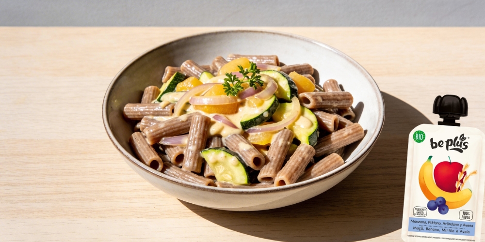 Una forma diferente de preparar una comida ligera y equilibrada. El pouch de manzana, plátano, arándanos y avena Be Plus se transforma en una salsa cremosa y ligeramente afrutada que combina sorprendentemente bien con pasta integral y verduras salteadas, aportando suavidad sin necesidad de salsas pesadas.
