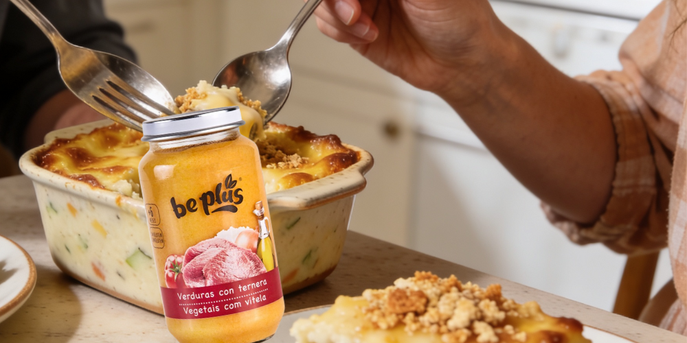En esta propuesta, el tarrito de verduras con ternera Be Plus se convierte en la base de un pastel templado, con una capa dorada que aporta textura y hace del plato una opción perfecta para compartir.