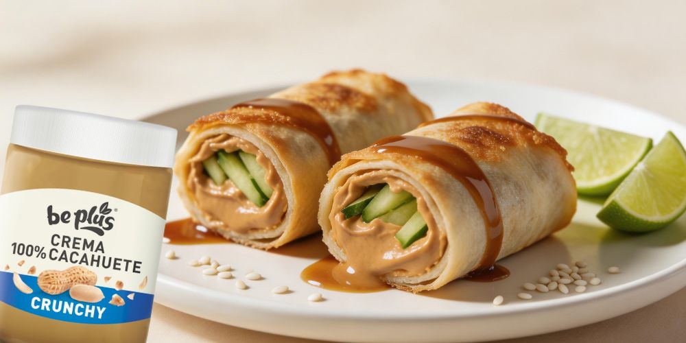Esta receta transforma la crema de cacahuete crunchy Be Plus en un snack salado‑dulce súper original: rollitos crujientes con dip especiado, perfectos para picar, meriendas o contenido de reels con contraste de texturas. El resultado es un bocado crujiente por fuera, suave y ligeramente picante por dentro, con ese toque tostado de cacahuete que engancha desde el primer mordisco.