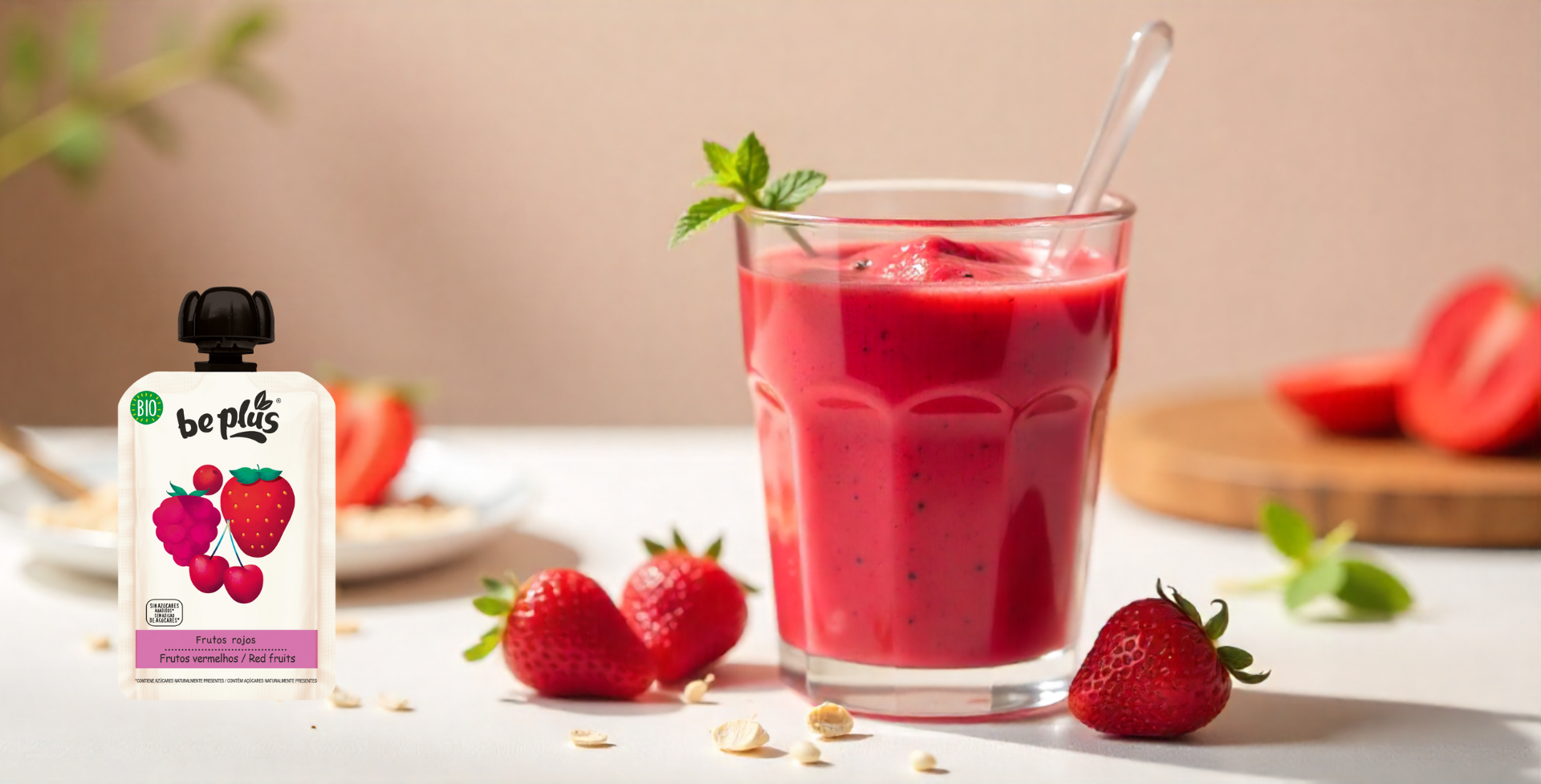 Convierte el pouch de frutos rojos Be Plus en un smoothie nutritivo y delicioso, ideal para bebés a partir de 4 meses, niños pequeños y toda la familia. Un desayuno o merienda rápido, lleno de antioxidantes, vitaminas y energía natural, que encanta tanto por su sabor como por su color vibrante.