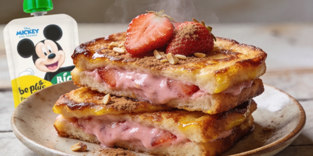 En esta receta, el pouch de fresa y plátano Be Plus se utiliza como base para aportar jugosidad y sabor a unas torrijas rápidas, transformando un clásico en una versión más ligera y afrutada. Su textura suave y su dulzor natural permiten reducir otros azúcares y conseguir un interior más cremoso y aromático.