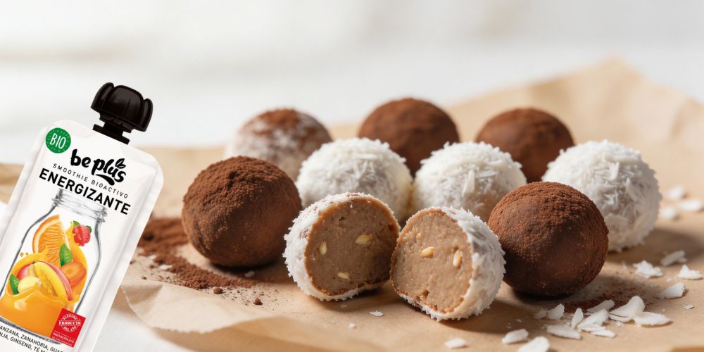Esta receta lleva el Smoothie Energizante Be Plus a un formato completamente distinto: unos “no-bake bites” tipo trufa energética, con textura densa, sabor frutal y un punto ligeramente tostado. El resultado es un snack compacto y funcional, perfecto para media mañana o pre-entreno, con ingredientes como mango, manzana y matcha que aportan energía natural sin necesidad de cocinar.