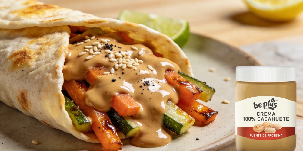 En esta receta, la crema de cacahuete Be Plus se transforma en una salsa caliente y envolvente que aporta profundidad y textura al plato. Al estar elaborada únicamente a partir de cacahuetes tostados triturados, sin aditivos ni azúcares añadidos, ofrece un perfil intenso, natural y muy versátil tanto en recetas dulces como saladas
