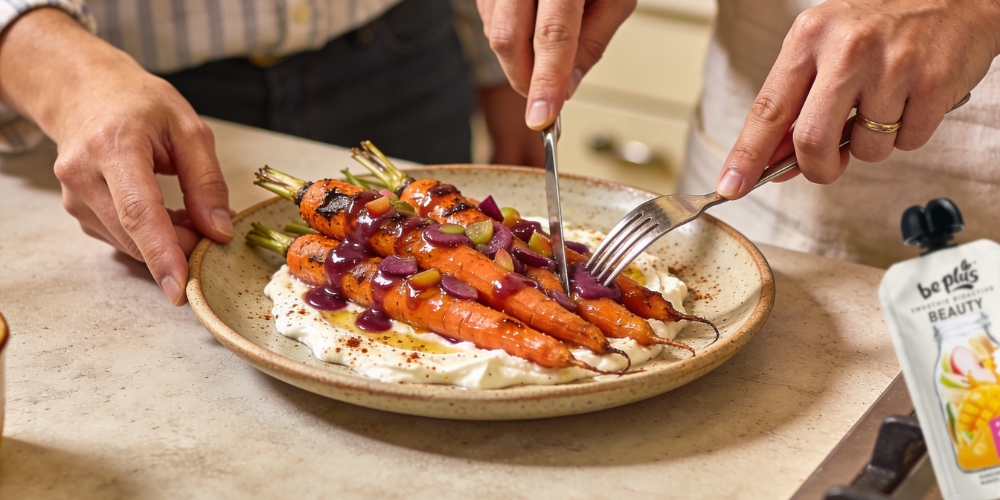 Cuidarse también puede formar parte de la cocina del día a día. Esta receta utiliza el Smoothie Beauty Bio Be Plus como base de un glaseado natural que acompaña a unas zanahorias asadas, creando un plato equilibrado y lleno de matices. Una propuesta pensada para cocinar entre dos, disfrutar del proceso y compartir un resultado que pone en valor cada ingrediente.